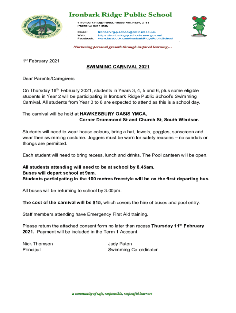 1st February 2021SWIMMING CARNIVAL 2021Dear Parents/Caregivers On Thursday 18th February 2021, students in Years 3, 4, 5 and 6, plus some eligible students in Year 2 will be participating in Ironbark