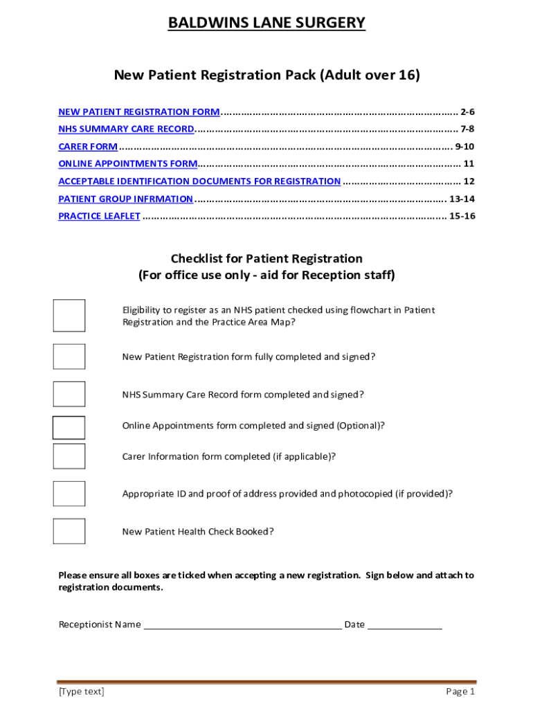 BALDWINS LANE SURGERY New Patient Registration Pack (Adult over 16) NEW PATIENT REGISTRATION FORM .................................................................................. 26 NHS SUMMARY