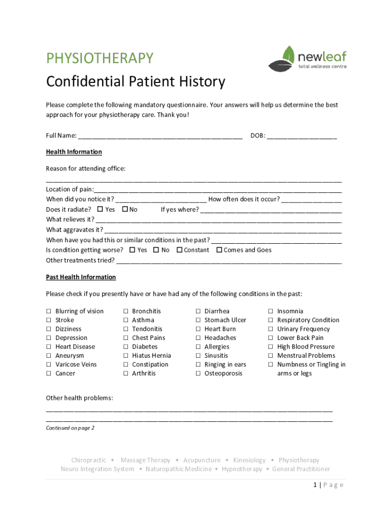 PHYSIOTHERAPY Confidential Patient History Please complete the following mandatory questionnaire. Your answers will help us determine the best approach for your physiotherapy care. Thank you! Full