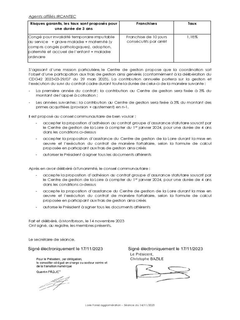 DEPARTEMENT DE LA LOIRE ARRONDISSEMENT DE MONTBRISONLOIRE FOREZ AGGLOMERATION ___ EXTRAIT DU REGISTRE DES DLIBRATIONS DU CONSEIL COMMUNAUTAIRE ___N 20231119Sance du mardi 14 novembre 2023 OBJET :