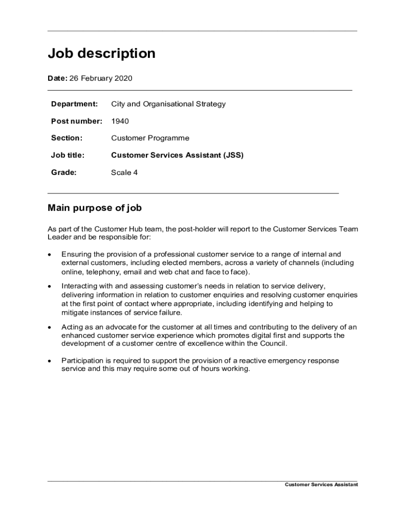 ___Job description Date: 26 February 2020 ___ Department:City and Organisational StrategyPost number:1940Section:Customer ProgrammeJob title:Customer Services Assistant (JSS)Grade:Scale 4___Main purpose
