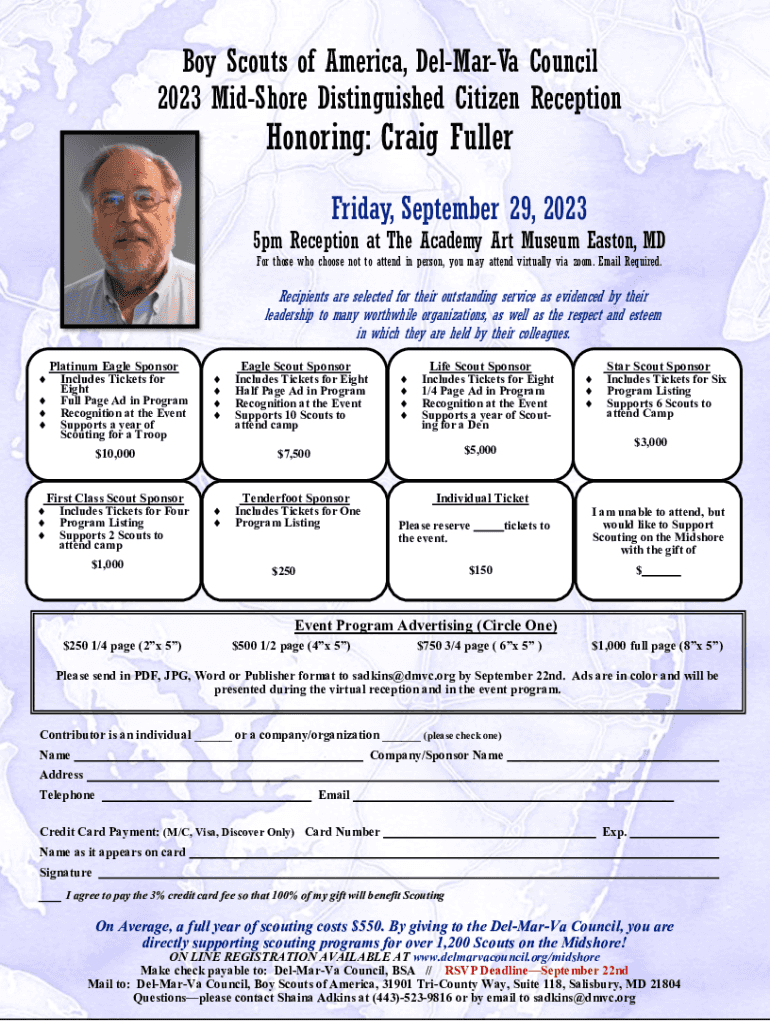 Boy Scouts of America, DelMarVa Council 2023 MidShore Distinguished Citizen ReceptionHonoring: Craig Fuller Friday, September 29, 2023 5pm Reception at The Academy Art Museum Easton, MD For those