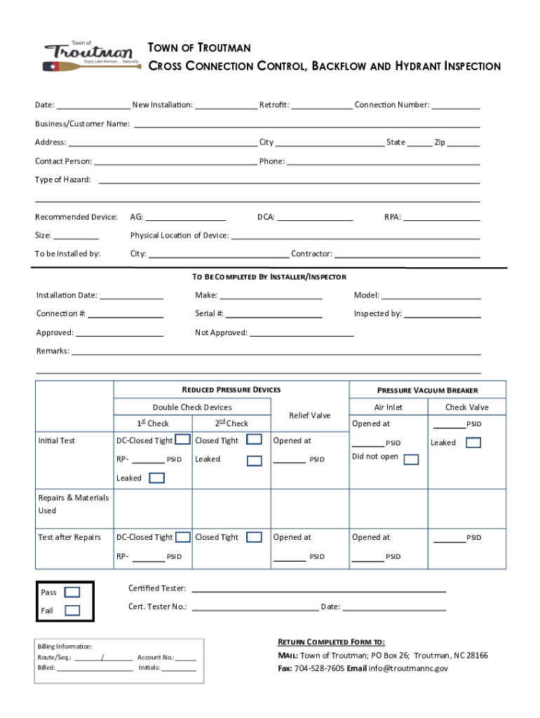 TOWN OF TROUTMAN CROSS CONNECTION CONTROL, BACKFLOW AND HYDRANT INSPECTION Date:New Installation:Retrofit:Connection Number:Business/Customer Name: Address:CityStateContact Person:Phone:ZipType of