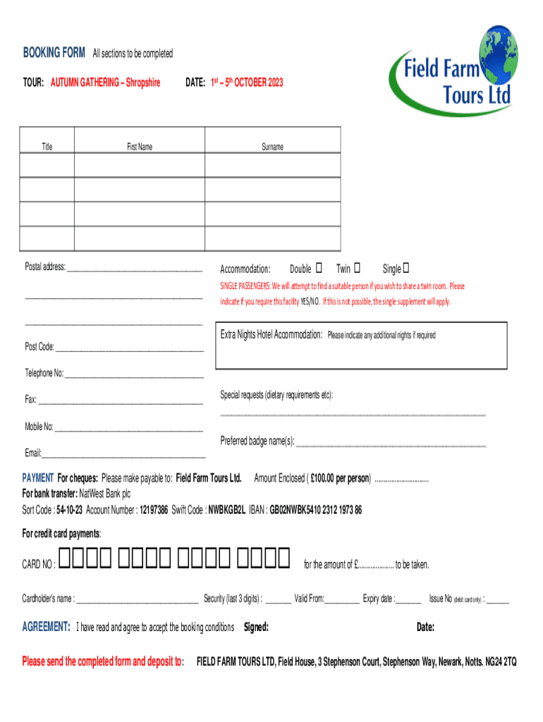 TOUR:AUTUMN GATHERING ShropshireTitleDATE: 1st 5th OCTOBER 2023First NameSurnameDouble Single Postal address: ___Accommodation:___SINGLE PASSENGERS: We will