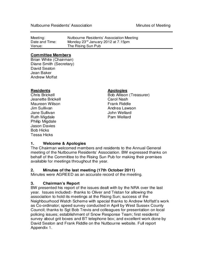 Nutbourne Residents Association Meeting: Date and Time: Venue:Minutes of MeetingNutbourne Residents Association Meeting Monday 23rd January 2012 at 7.15pm The Rising Sun PubCommittee Members Brian