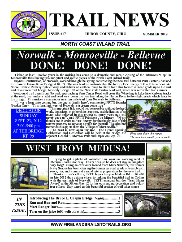 TRAIL NEWS ISSUE #17HURON COUNTY, OHIOSUMMER 2012NORTH COAST INLAND TRAILNorwalk Monroeville Bellevue DONE! DONE! DONE! Linked at last! Twelve years in the making has come to a dramatic and scenic