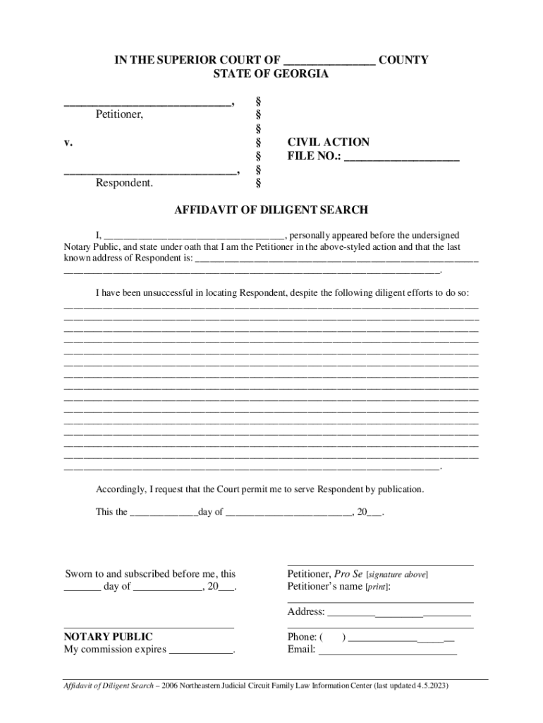 IN THE SUPERIOR COURT OF ___ COUNTY STATE OF GEORGIA ___, Petitioner, v. ___, Respondent. CIVIL ACTION FILE NO.: ___AFFIDAVIT OF DILIGENT SEARCH I, ___, personally appeared before the undersigned
