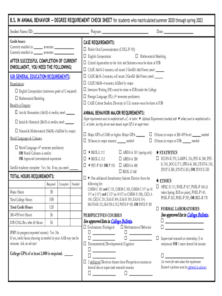 B.S. IN ANIMAL BEHAVIOR DEGREE REQUIREMENT CHECK SHEET for students who matriculated summer 2020 through spring 2022 Student Name/ID: ___ Purpose: ___ Credit hours: Currently enrolled in: ___ semester: