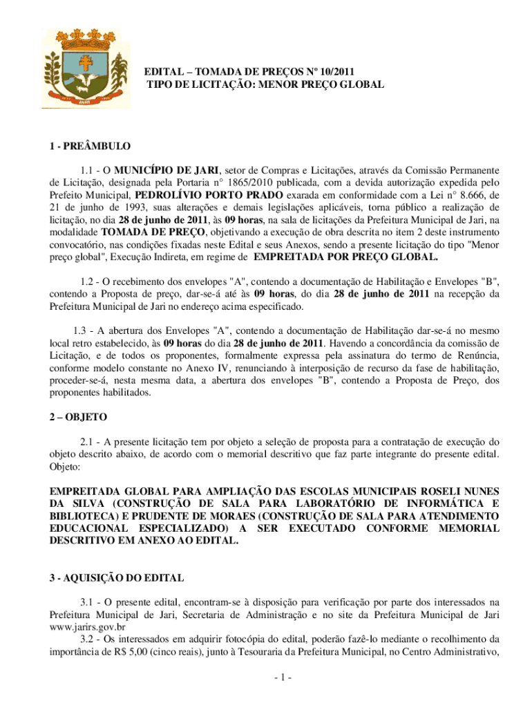EDITAL TOMADA DE PREOS N 10/2011 TIPO DE LICITAO: MENOR PREO GLOBAL1 PREMBULO 1.1 O MUNICPIO DE JARI, setor de Compras e Licitaes, atravs da Comisso Permanente de Licitao, designada pela Portaria