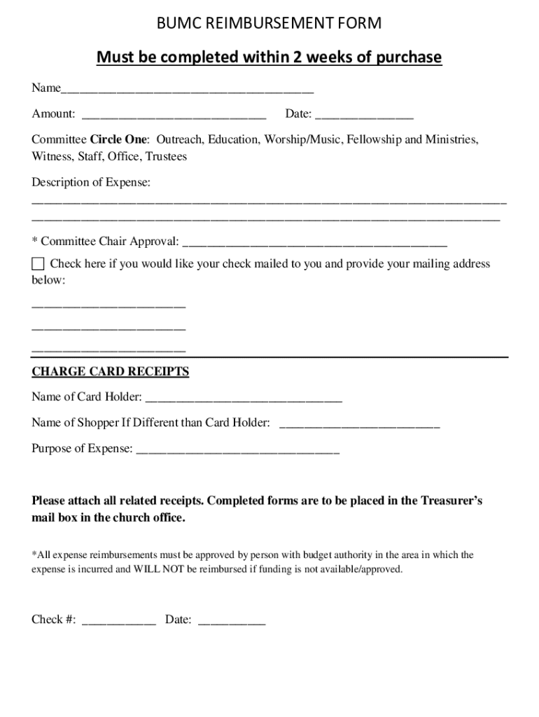 BUMC REIMBURSEMENT FORM Must be completed within 2 weeks of purchase Name___ Amount: ___Date: ___Committee Circle One: Outreach, Education, Worship/Music, Fellowship and Ministries, Witness, Staff,