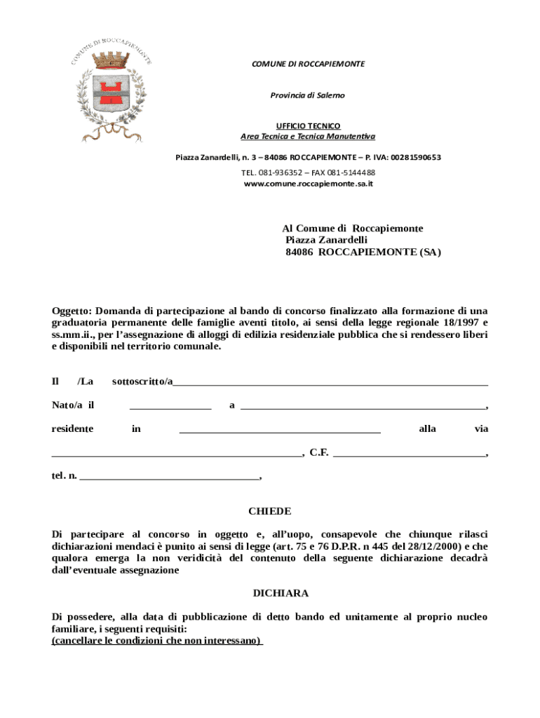 COMUNE DI ROCCAPIEMONTE Provincia di Salerno UFFICIO TECNICO Area Tecnica e Tecnica Manutentva Piazza Zanardelli, n. 3 84086 ROCCAPIEMONTE P. IVA: 00281590653 TEL. 081936352 FAX 0815144488 www.comune.roccapiemonte.sa.itAl