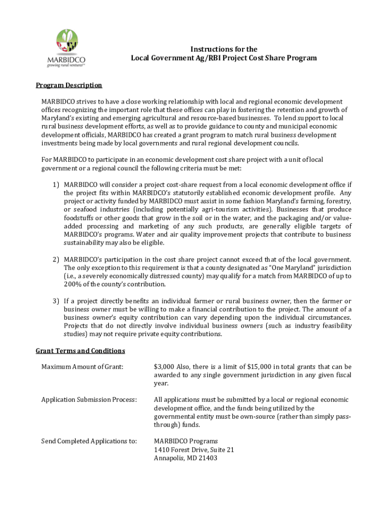 Instructions for the Local Government Ag/RBI Project Cost Share Program Program Description MARBIDCO strives to have a close working relationship with local and regional economic development offices