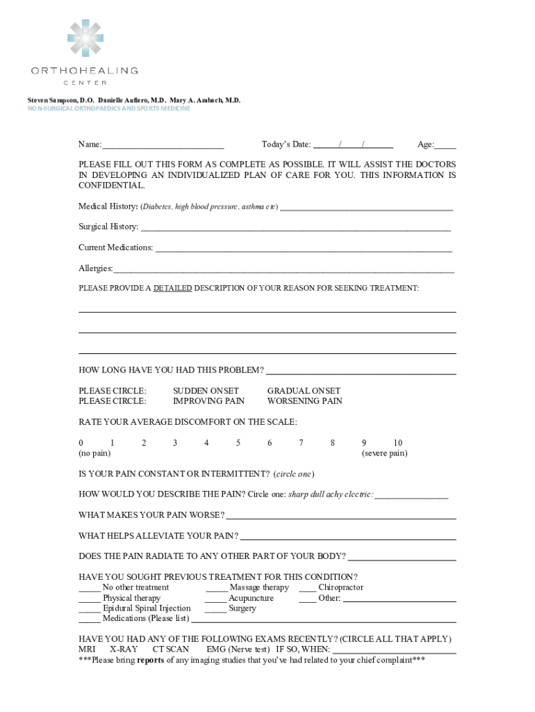 Steven Sampson, D.O. Danielle Aufiero, M.D. Mary A. Ambach, M.D. NONSURGICAL ORTHOPAEDICS AND SPORTS MEDICINEName:___ HEALTH QUESTIONNAIRETodays Date://Age:___PLEASE FILL OUT THIS FORM AS COMPLETE
