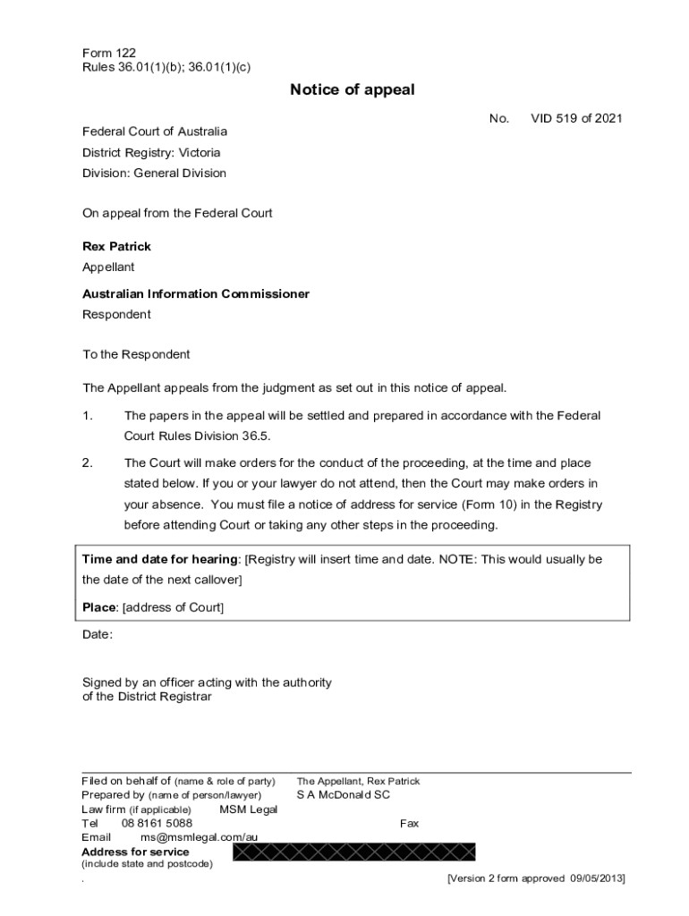 Form 122 Rules 36.01(1)(b); 36.01(1)(c)Notice of appeal No.VID 519 of 2021Federal Court of Australia District Registry: Victoria Division: General Division On appeal from the Federal Court Rex Patrick