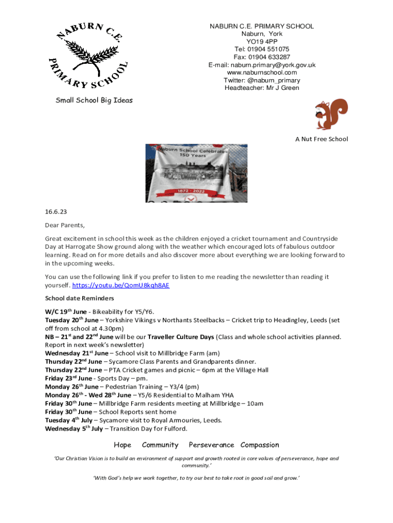 NABURN C.E. PRIMARY SCHOOL Naburn, York YO19 4PP Tel: 01904 551075 Fax: 01904 633287 Email: naburn.primary@york.gov.uk www.naburnschool.com Twitter: @naburn_primary Headteacher: Mr J GreenSmall School