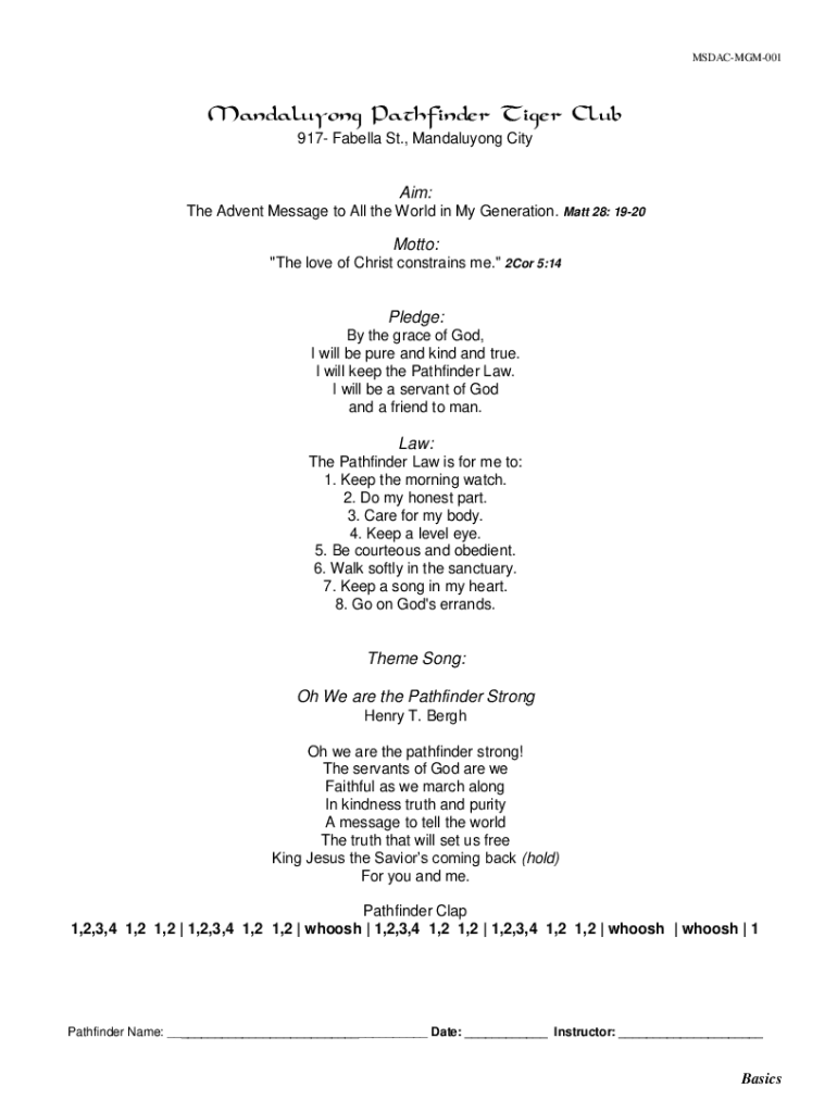 MSDACMGM001Mandaluyong Pathfinder Tiger Club 917 Fabella St., Mandaluyong CityAim: The Advent Message to All the WorId in My Generation. Matt 28: 1920Motto: \"The love of Christ constrains me.\" 2Cor