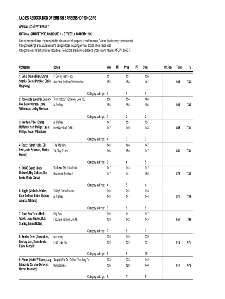 LADIES ASSOCIATION OF BRITISH BARBERSHOP SINGERS OFFICIAL CONTEST RESULT NATIONAL QUARTET PRELIMS ROUND 1 STREETLY ACADEMY: 2013 Scores from semifinals are normalised to take account of any panel