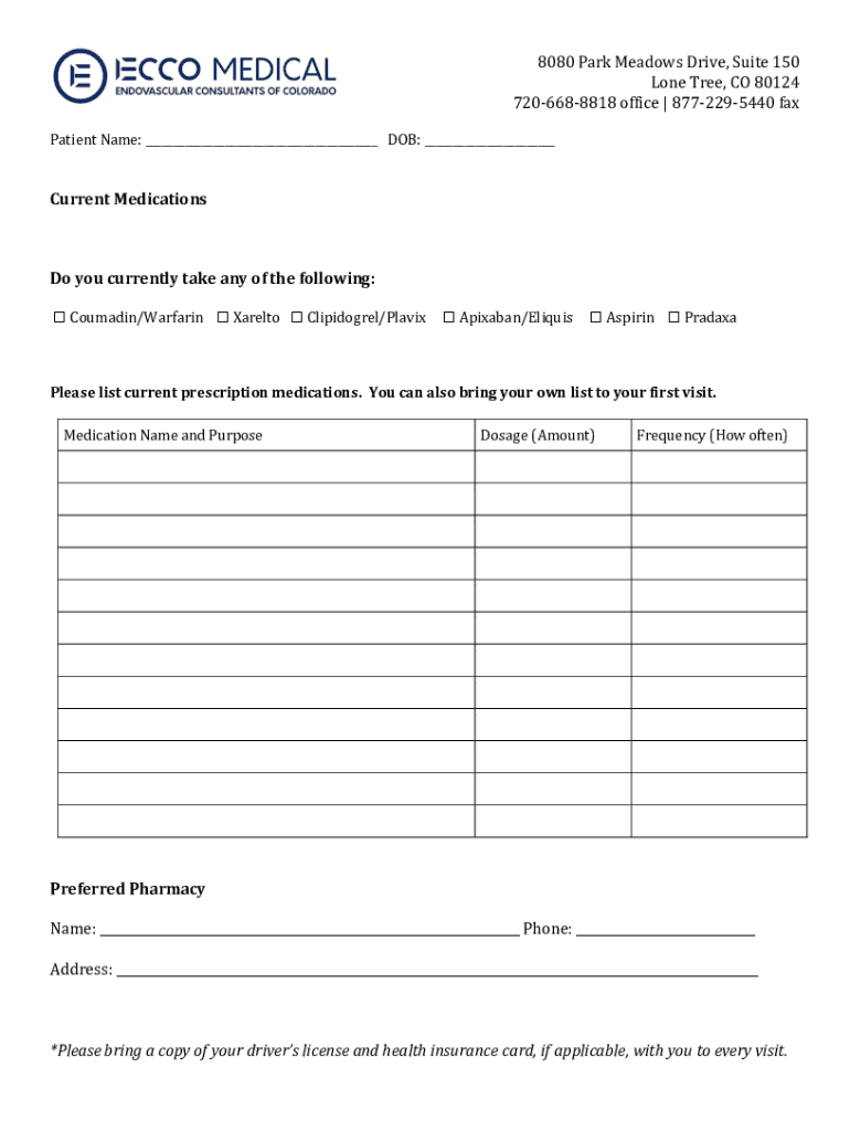 8080 Park Meadows Drive, Suite 150Lone Tree, CO 801247206688818 office | 8772295440 faxPatient Name: ___DOB: ___Current MedicationsDo you currently take any of the following: / Clipidogrel/ / Aspirin