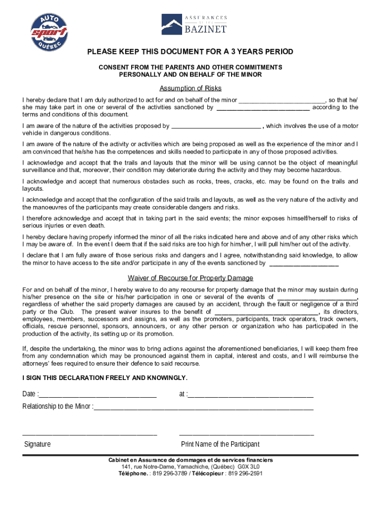 PLEASE KEEP THIS DOCUMENT FOR A 3 YEARS PERIOD CONSENT FROM THE PARENTS AND OTHER COMMITMENTS PERSONALLY AND ON BEHALF OF THE MINORAssumption of Risks I hereby declare that I am duly authorized to