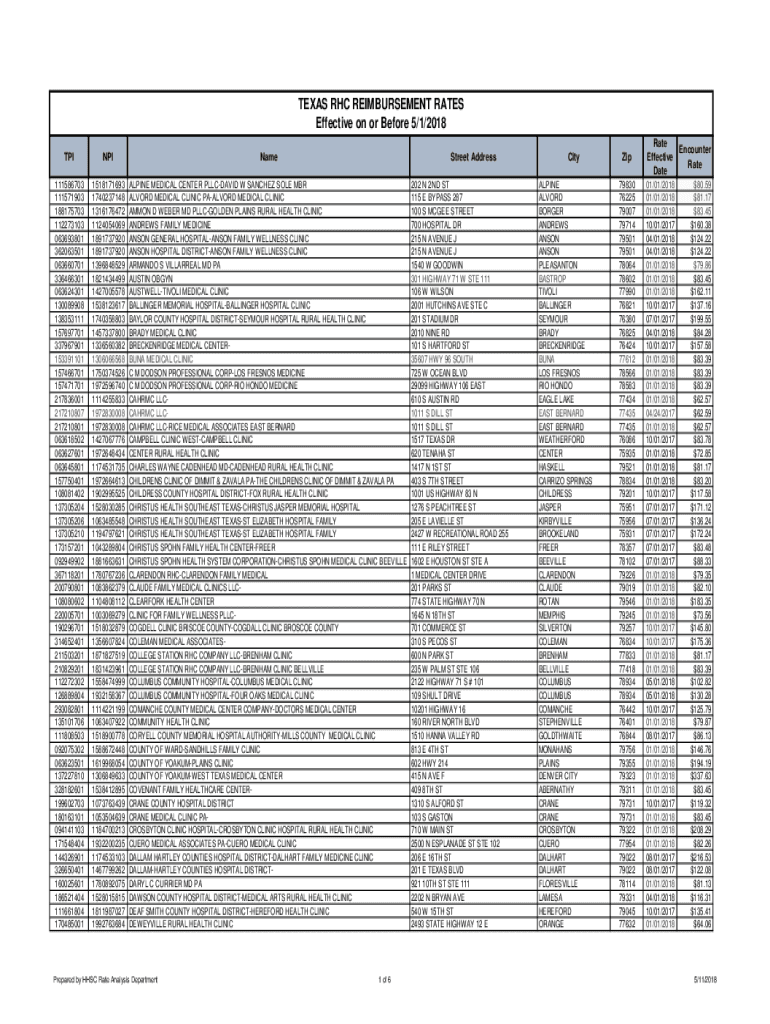 TEXAS RHC REIMBURSEMENT RATES Effective on or Before 5/1/2018 TPINPIName111586703 111571903 188175703 112273103 063693801 362063501 063660701 336466301 063624301 130089908 138353111 157697701 337967901