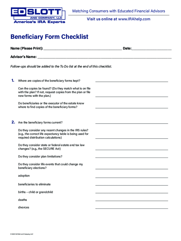 Matching Consumers with Educated Financial Advisors Visit us online at www.IRAhelp.comBeneficiary Form Checklist Name (Please Print):___ Date:___ Advisors Name:___ Followups should be added to the