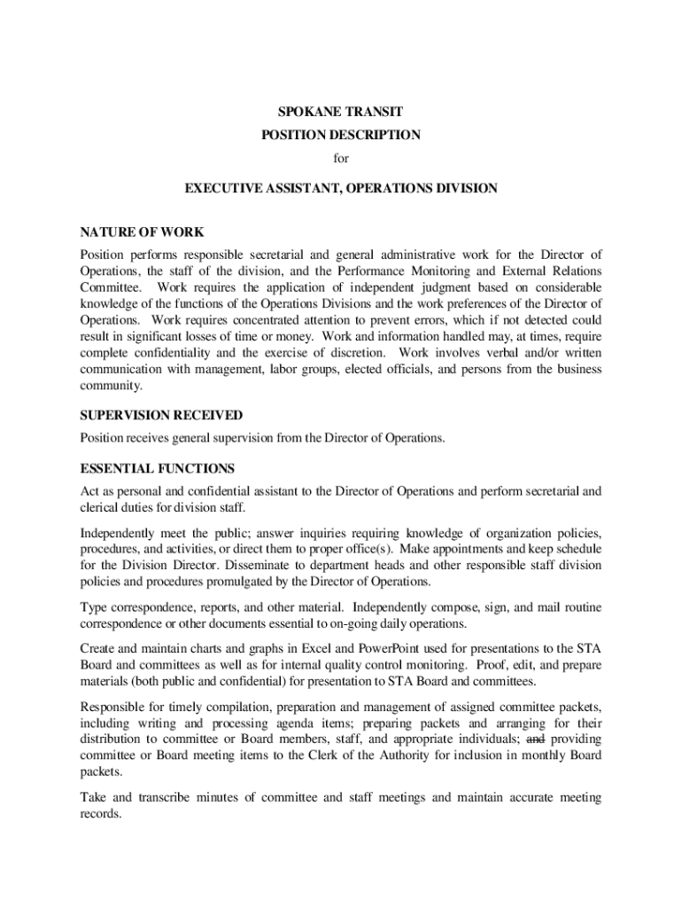 SPOKANE TRANSIT POSITION DESCRIPTION for EXECUTIVE ASSISTANT, OPERATIONS DIVISION NATURE OF WORK Position performs responsible secretarial and general administrative work for the Director of Operations,