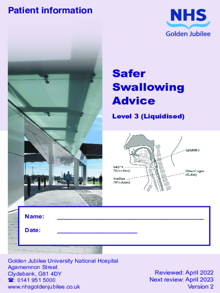 Patient informationSafer Swallowing Advice Level 3 (Liquidised)Name: ___Date: ___Golden Jubilee University National Hospital Agamemnon StreetClydebank, G81 4DY (: 0141 951 5000 www.nhsgoldenjubilee.co.ukReviewed: