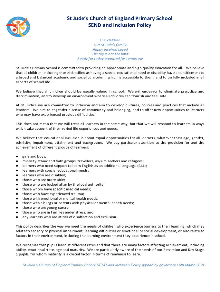 St Judes Church of England Primary School SEND and Inclusion Policy Our children Our St Judes family Happy Inspired Loved The sky is not the limit Ready for today prepared for tomorrow St. Judes Primary