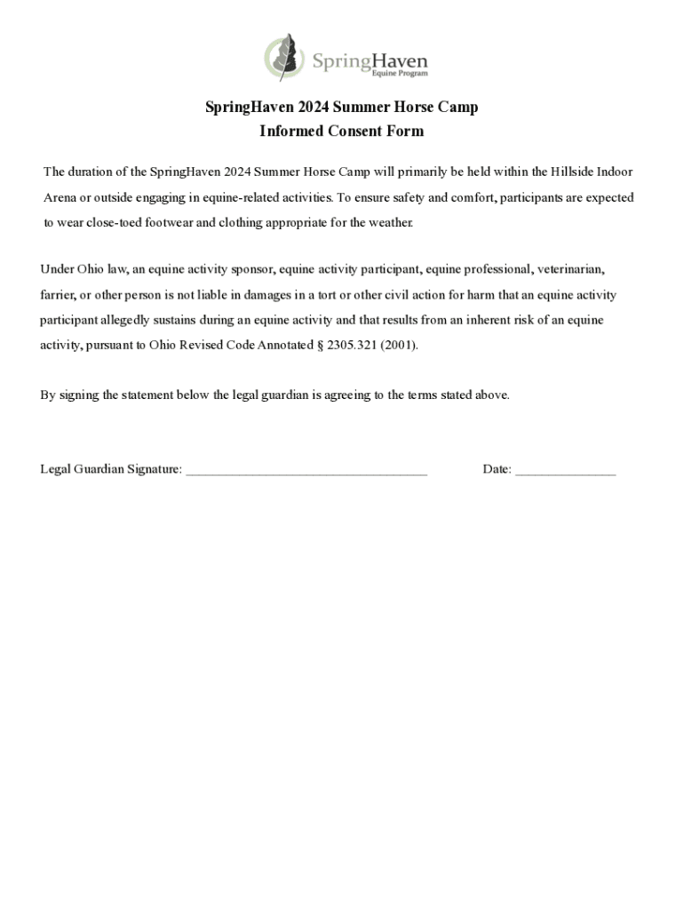 SpringHaven 2024 Summer Horse Camp Informed Consent Form The duration of the SpringHaven 2024 Summer Horse Camp will primarily be held within the Hillside Indoor Arena or outside engaging in equinerelated