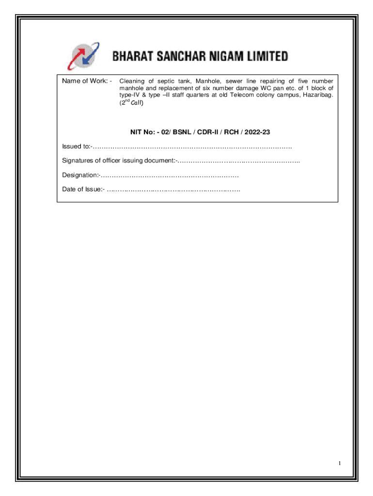 Name of Work: Cleaning of septic tank, Manhole, sewer line repairing of five number manhole and replacement of six number damage WC pan etc. of 1 block of typeIV & type II staff quarters at old Telecom