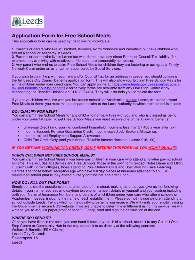 Application Form for Free School Meals This application form can be used by the following individuals: 1. Parents or carers who live in Bradford, Kirklees, North Yorkshire and Wakefield but have children