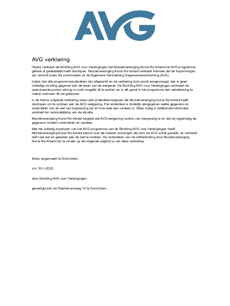 AVG verklaring Hierbij verklaart de Stichting AVG voor Verenigingen dat Muziekvereniging Kunst Na Arbeid het AVGprogramma geheel of gedeeltelijk heeft doorlopen. Muziekvereniging Kunst Na Arbeid verklaart