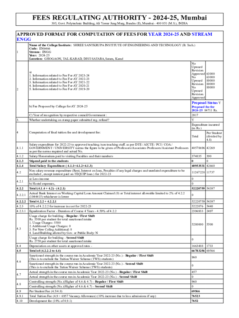 FEES REGULATING AUTHORITY 202425, Mumbai 305, Govt. Polytechnic Building, Ali Yawar Jung Marg, Bandra (E), Mumbai 400 051 (M.S.), INDIAAPPROVED FORMAT FOR COMPUTATION OF FEES FOR YEAR 202425 AND STREAM