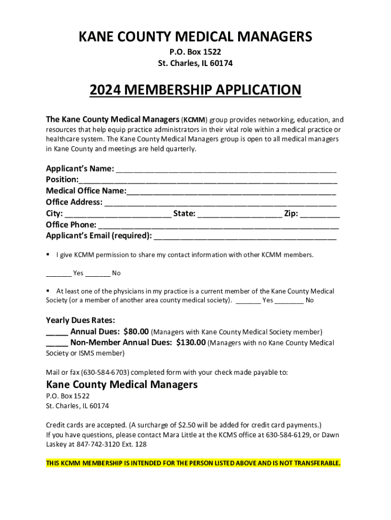 KANE COUNTY MEDICAL MANAGERS P.O. Box 1522 St. Charles, IL 601742024 MEMBERSHIP APPLICATION The Kane County Medical Managers (KCMM) group provides networking, education, and resources that help equip