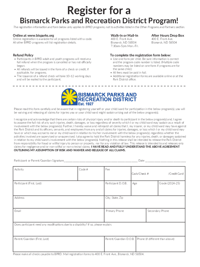 Register for aBismarck Parks and Recreation District Program!The registration information and form below only applies to BPRD programs, not to activities listed in the Other Programs and Partners