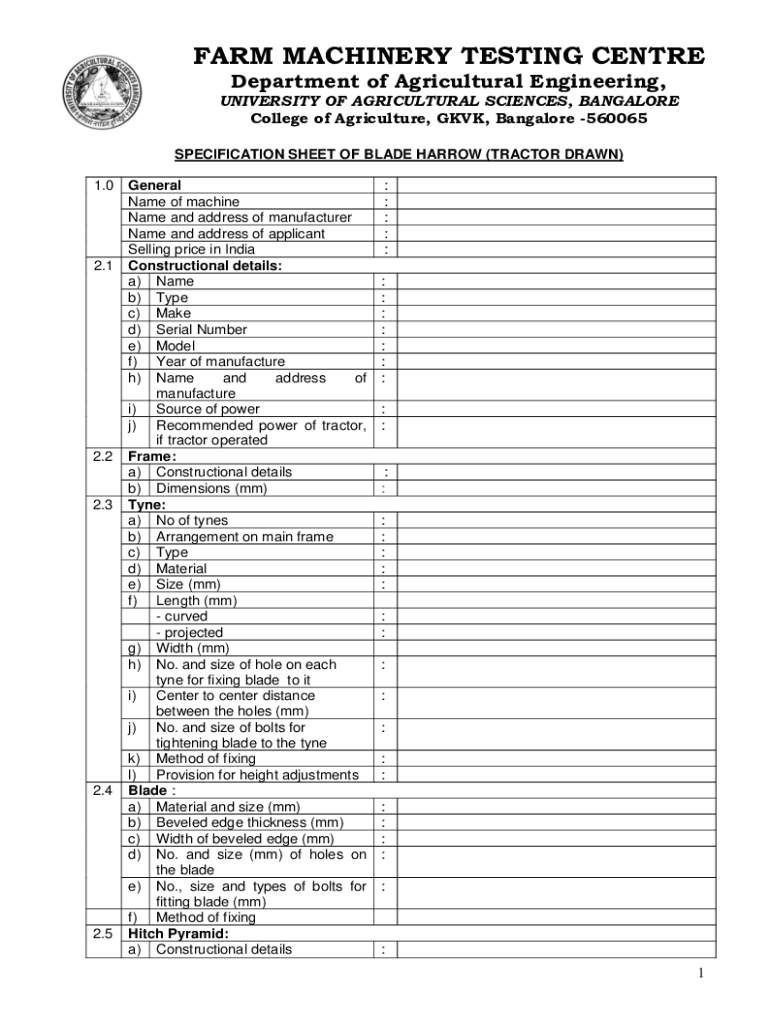 FARM MACHINERY TESTING CENTRE Department of Agricultural Engineering, UNIVERSITY OF AGRICULTURAL SCIENCES, BANGALORE College of Agriculture, GKVK, Bangalore 560065 SPECIFICATION SHEET OF BLADE HARROW