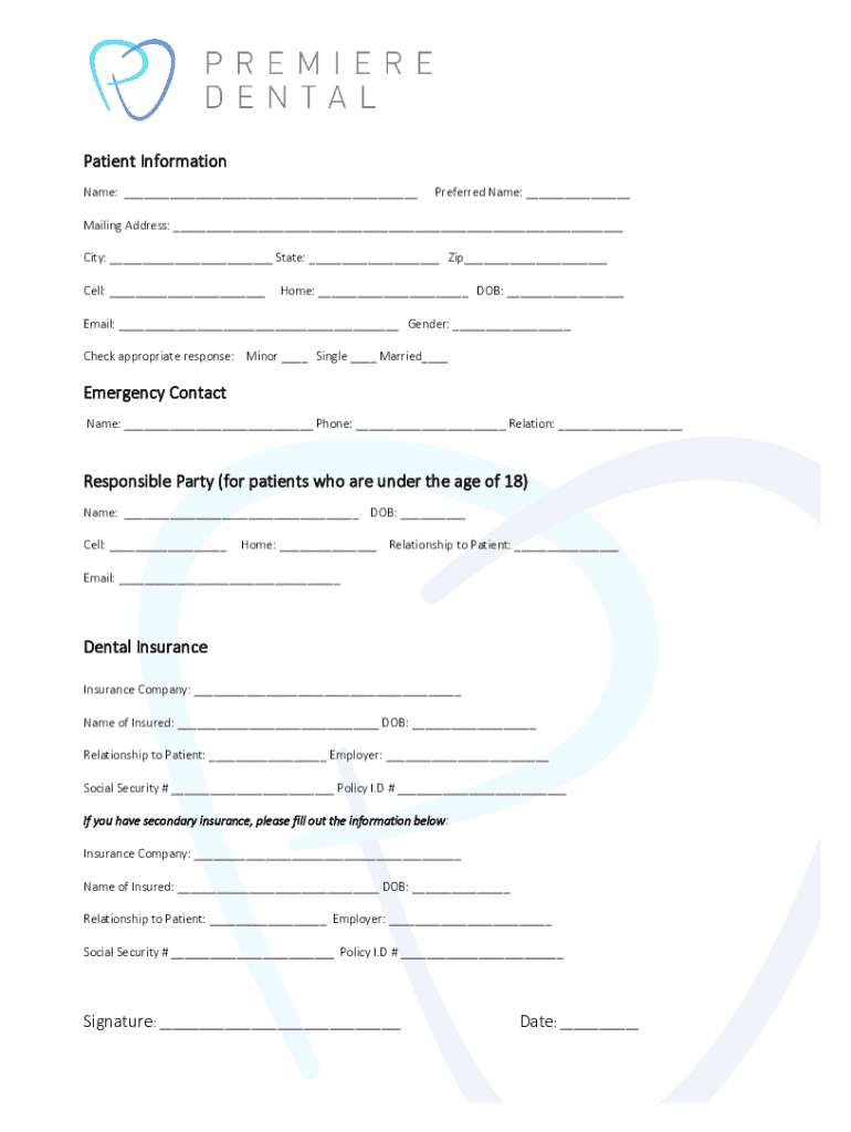 PatientInformation Name:___PreferredName:___ MailingAddress:___ City:___State:___Zip___ Cell:___Home:___DOB:___ Email:___Gender:___ Checkappropriateresponse:Minor___Single___Married___EmergencyContact
