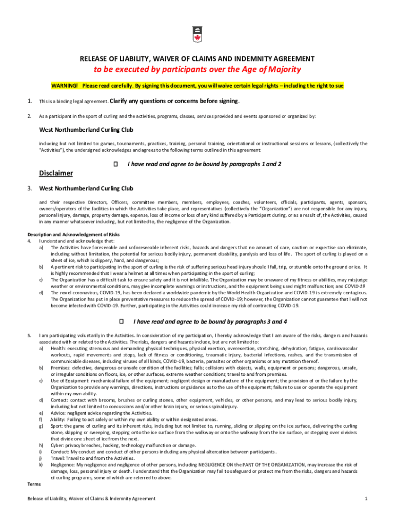 RELEASE OF LIABILITY, WAIVER OF CLAIMS AND INDEMNITY AGREEMENTto be executed by participants over the Age of Majority WARNING! Please read carefully. By signing this document, you will waive certain