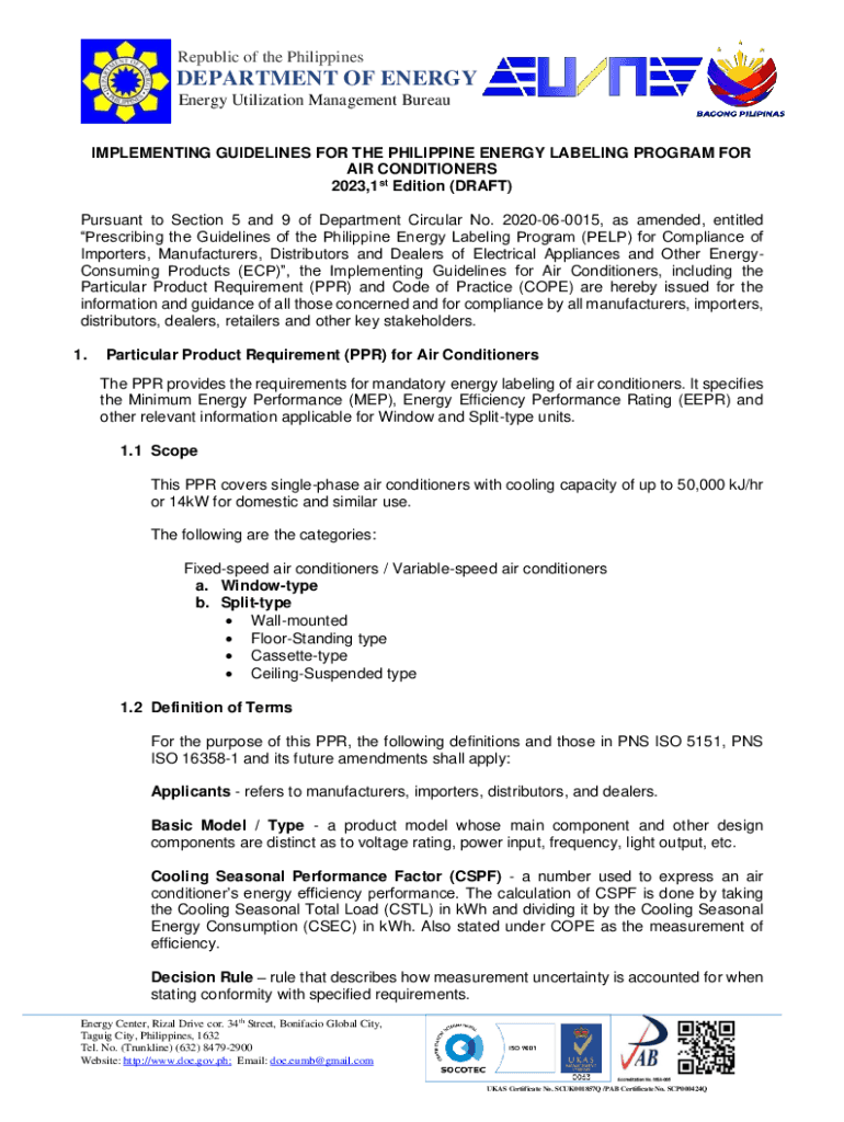 Republic of the PhilippinesDEPARTMENT OF ENERGY Energy Utilization Management Bureau IMPLEMENTING GUIDELINES FOR THE PHILIPPINE ENERGY LABELING PROGRAM FOR AIR CONDITIONERS 2023,1st Edition (DRAFT)