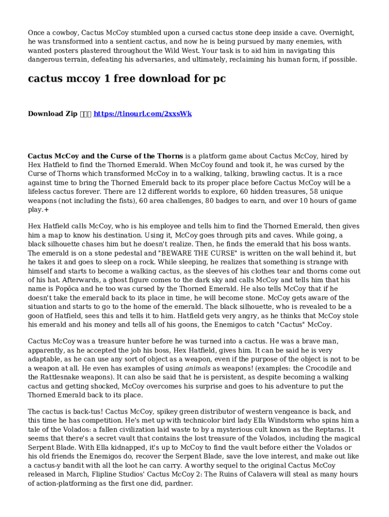 Once a cowboy, Cactus McCoy stumbled upon a cursed cactus stone deep inside a cave. Overnight, he was transformed into a sentient cactus, and now he is being pursued by many enemies, with wanted posters