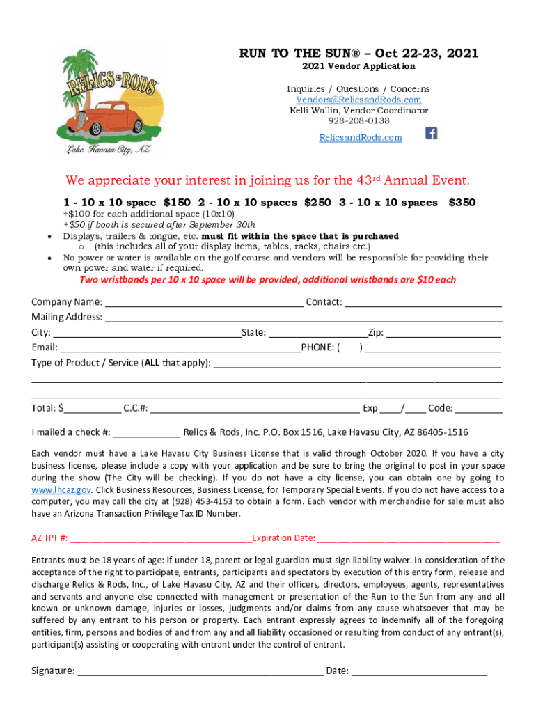 RUN TO THE SUN Oct 2223, 2021 2021 Vendor Application Inquiries / Questions / Concerns Vendors@RelicsandRods.com Kelli Wallin, Vendor Coordinator 9282080138 RelicsandRods.comWe appreciate your interest