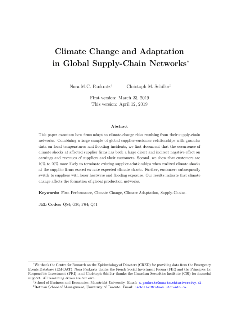 Climate Change and Adaptation in Global SupplyChain Networks Nora M.C. PankratzChristoph M. SchillerFirst version: March 23, 2019 This version: April 12, 2019Abstract This paper examines how firms
