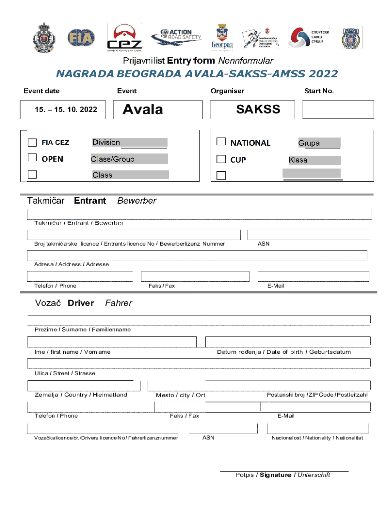 Prijavni list Entry form NennformularNAGRADA BEOGRADA AVALASAKSSAMSS 2022 Event dateEventOrganiserAvala 201815. 15. 10. 2022Start No.SAKSSFIA CEZDivisionNATIONALOPENClass/GroupCUPGrupa KlasaClassTakmiarEntrantBewerberTakmiar