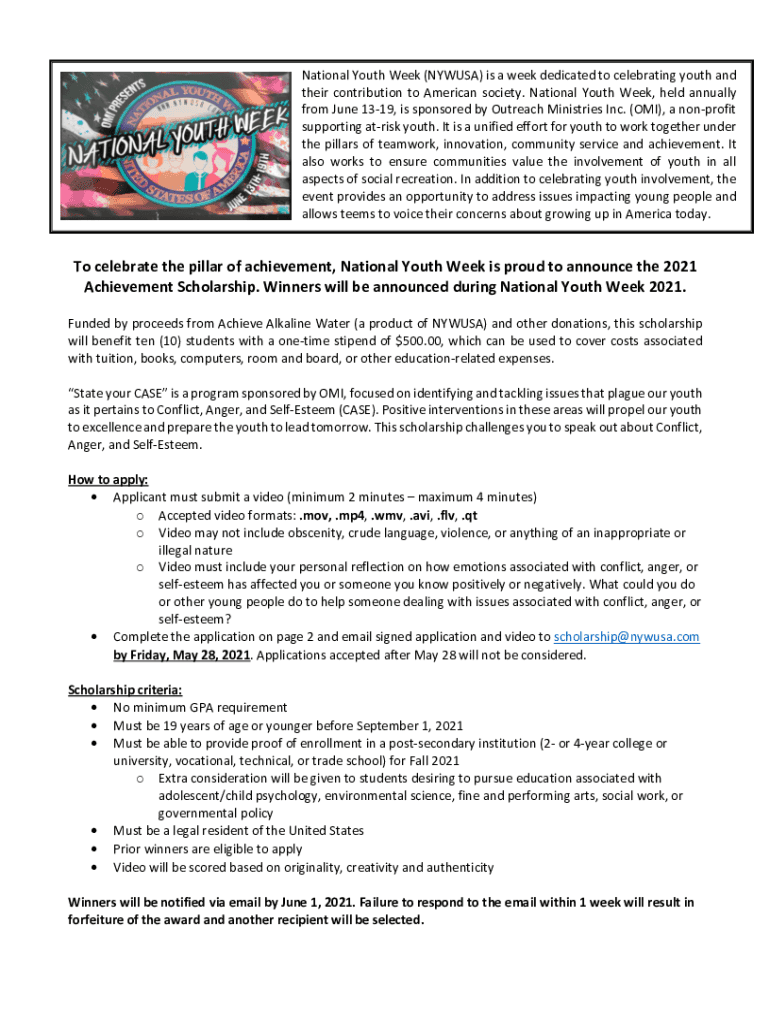To fill out the National Youth Week Form, participants should provide relevant details including event information, organizer contact details, and a description of activities planned for the week.