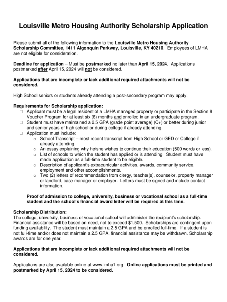 Louisville Metro Housing Authority Scholarship Application Please submit all of the following information to the Louisville Metro Housing Authority Scholarship Committee, 1411 Algonquin Parkway, Louisville,