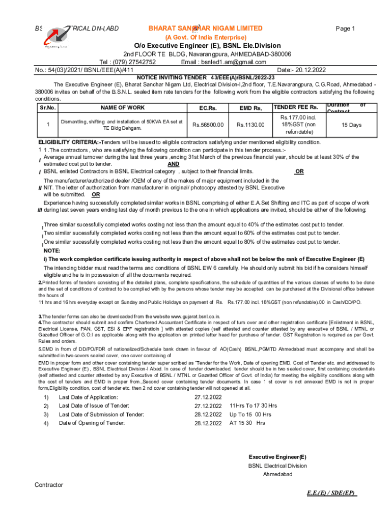 BHARAT SANCHAR NIGAM LIMITEDBSNL ELECTRICAL DNI,ABDPage 1(A Govt. Of India Enterprise)O/o Executive Engineer (E), BSNL Ele.Division 2nd FLOOR TE BLDG, Navarangpura, AHMEDABAD380006 Tel : (079) 27542752