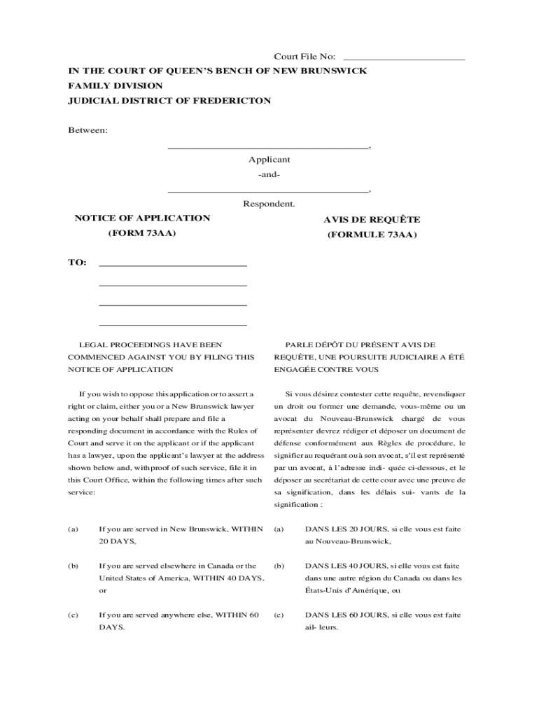 Court File No: ___ IN THE COURT OF QUEENS BENCH OF NEW BRUNSWICK FAMILY DIVISION JUDICIAL DISTRICT OF FREDERICTONBetween: ___, Applicant and___, Respondent. NOTICE OF APPLICATIONAVIS DE REQUTE(FORM