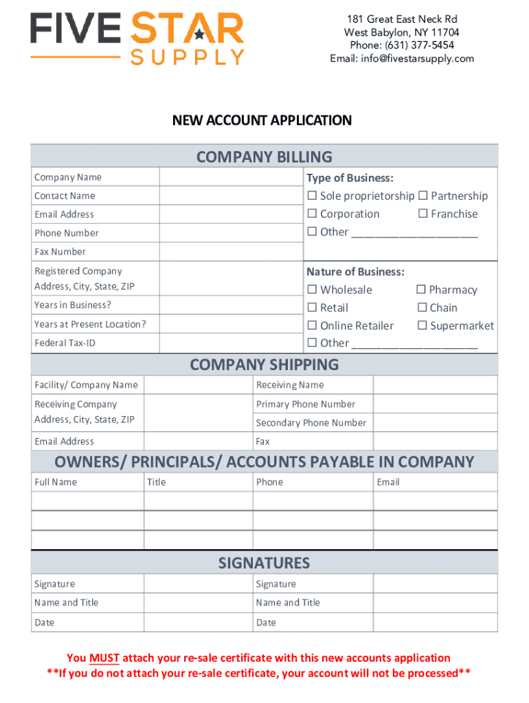 181 Great East Neck Rd West Babylon, NY 11704 Phone: (631) 3775454 Email: info@fivestarsupply.comRT ReGo Trading Wholesale DistributorNEW ACCOUNT APPLICATIONCOMPANY BILLING Type of Business: Sole