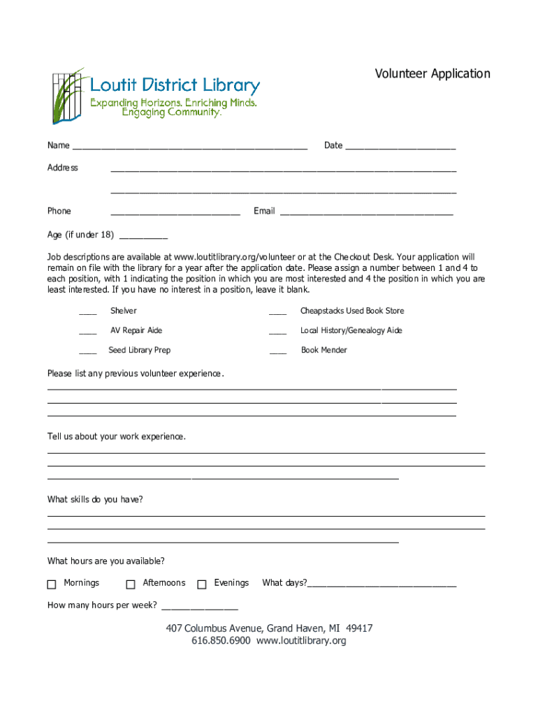 Job descriptions are available at www.loutitlibrary.org/volunteer or at the Checkout Desk. Your application