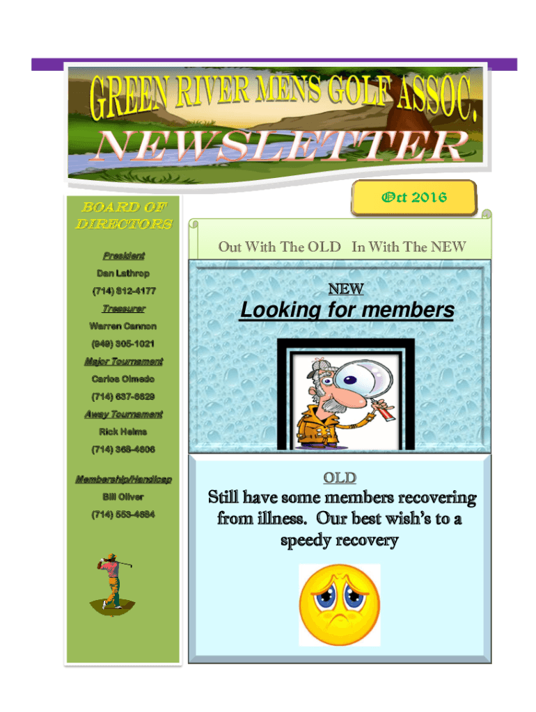 Board of Directors PresidentOut With The OLD In With The NEWDan Lathrop (714) 8124177NEWTreasurerLooking for membersWarren Cannon (949) 3051021Major Tournament Carlos Olmedo (714) 6376629Away Tournament